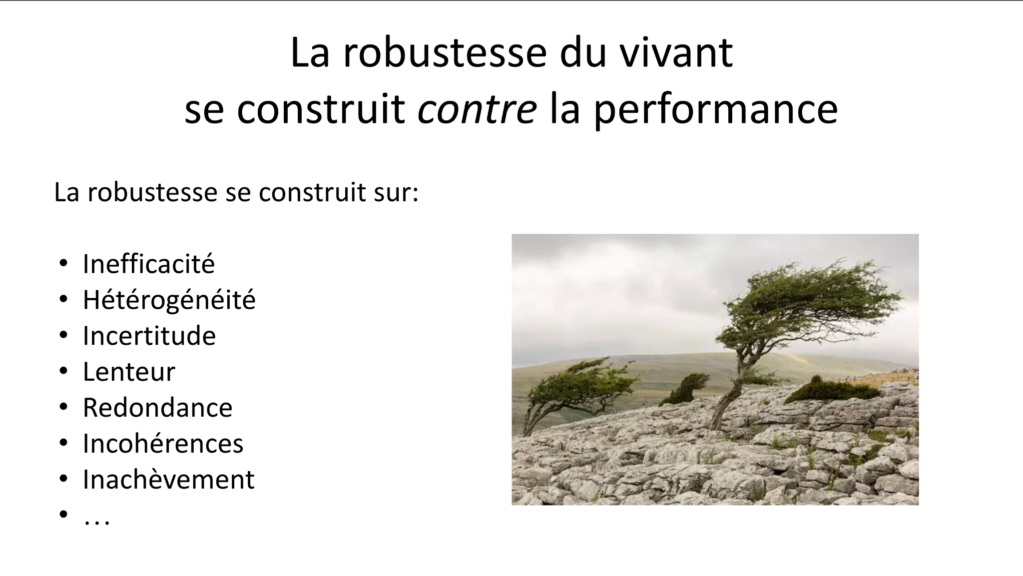 Être performant signifie que l'on est très adapté à notre écosystème. Or, dans un monde qui change, être adapté est une fragilité. Dans un monde fluctuant, il faut être adaptable, avoir de la marge et donc être robuste. La performance a toujours été recherchée par l’humanité, associée au progrès, mais a contrario, le monde du vivant entier est construit sur le modèle de la robustesse, raison principale de l'adaptation des espèces aux fluctuations.