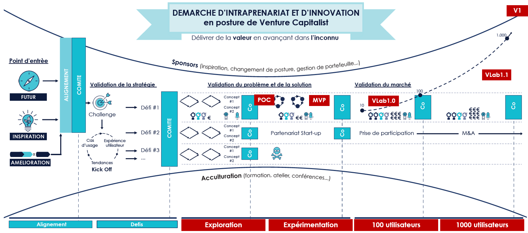 Une démarche d’innovation inspirée de la double posture de l’Entrepreneur et du Venture Capitalist a été décrite dans notre précédent article “Innover comme une startup & investir comme un VC (Venture Capitalist)” puis lors de notre matinale sur l’innovation en mai dernier (la vidéo, le CR).