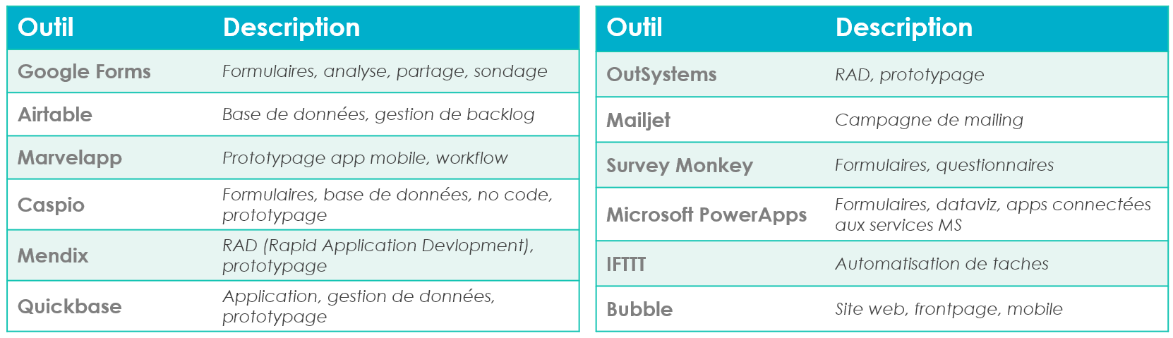 A titre d’illustration, voici quelques exemples de solutions “Low Code”, “No Code”.