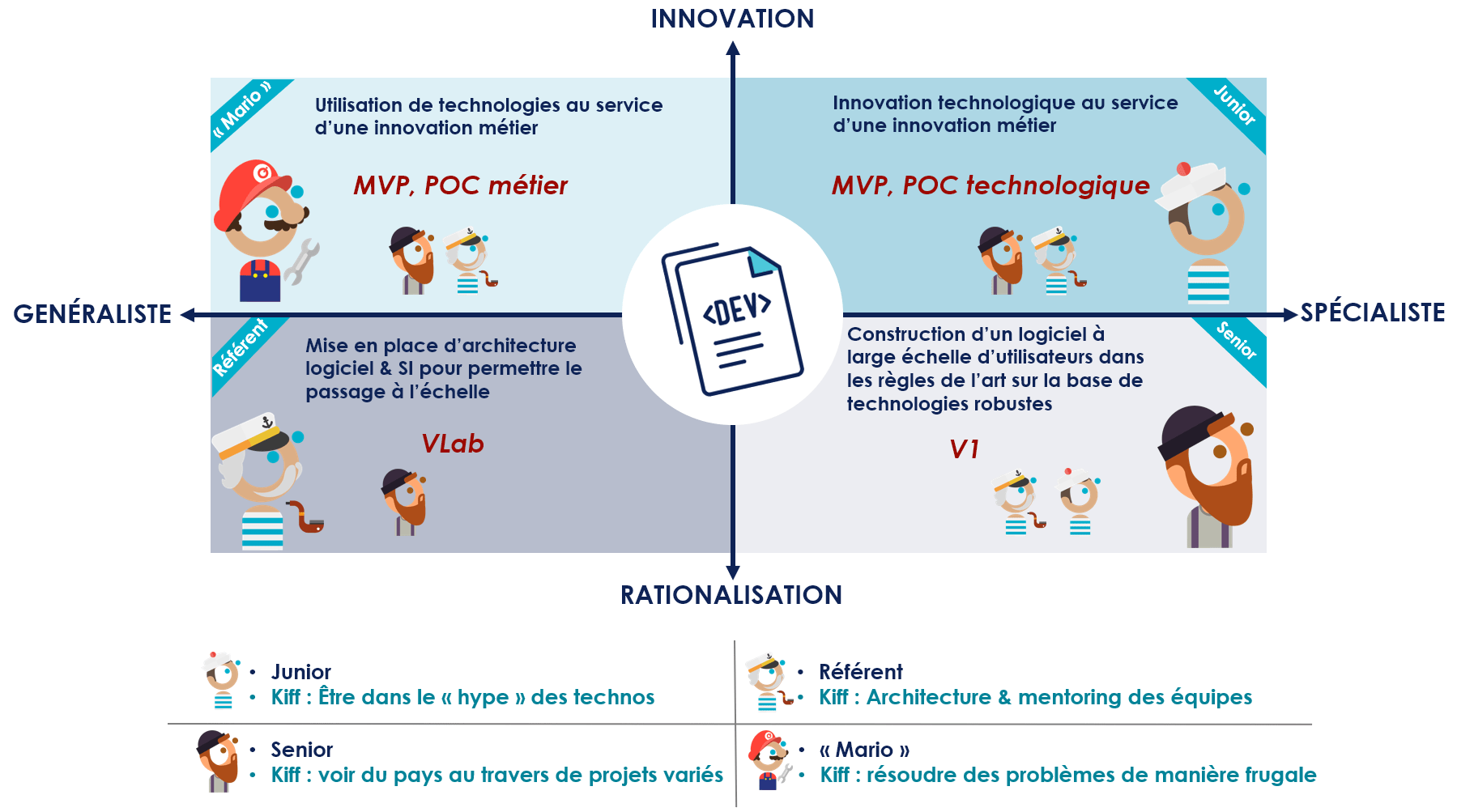 - Les profils séniors sont cruciaux pour construire un logiciel à large échelle d’utilisateurs et éviter les chausse-trappes. Pour faciliter un passage à l’échelle des profils référents Ops ou Craft peuvent venir compléter le dispositif.