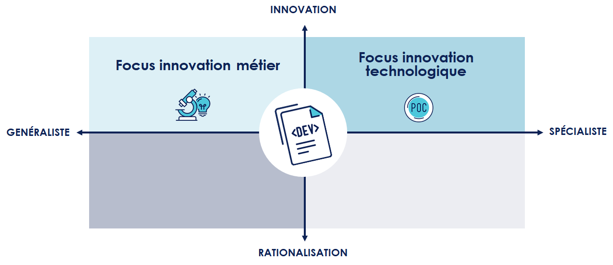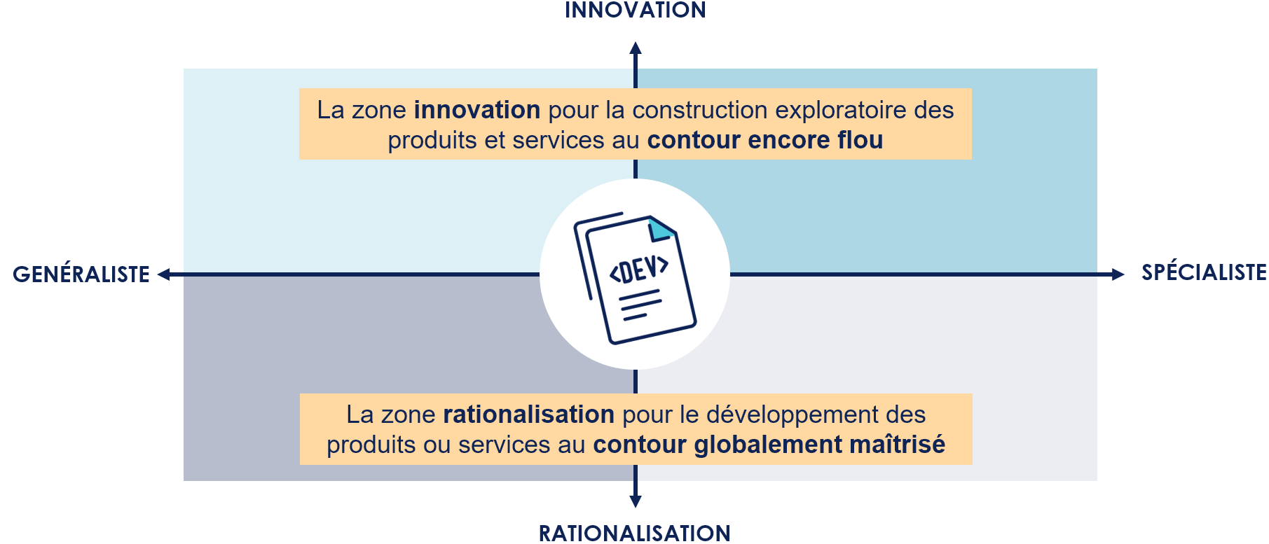 - Sur l’axe des ordonnées, on positionne les objectifs : en bas la zone rationalisation, destinée aux développements logiciels stables et globalement maîtrisés, en haut la zone innovation, exploratoire et globalement en évolution.
