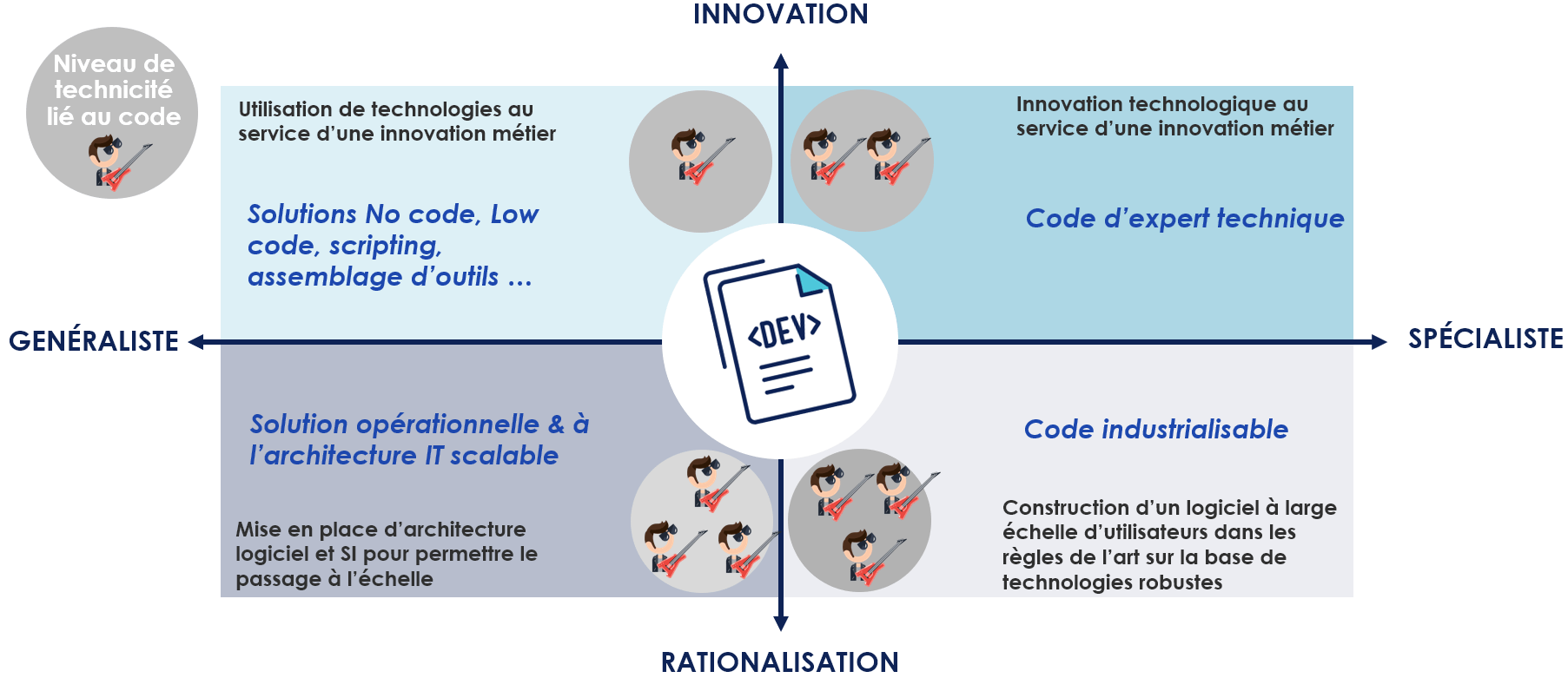 - Notez que dans la zone d’innovation métier (“focus innovation métier”) il est nécessaire d’être en pleine conscience que les solutions produites sont potentiellement imparfaites techniquement, jetables et que la plupart du temps, elles ne passent pas à l’échelle.
