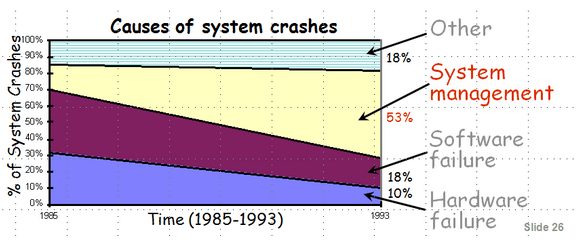 que les principales pannes sont liées à des problèmes de configuration, de software ou même humain. Ce qu’à également montré cette étude issue de Recovery Oriented Computer project de Berkeley, c’est que le taux d’erreurs liées au system management n’a fait qu’augmenter (et je ne pense pas que cette courbe se soit inversée depuis 1993, nos systèmes étant encore plus complexes, distribués…)
