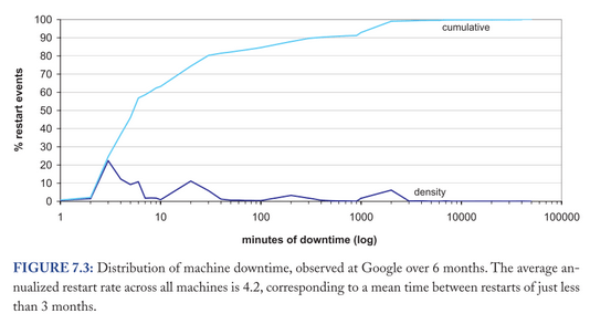Google présente un graphe intéressant : l’axe des x représente le temps de downtime - tout type d’arrêt confondu (donc avec maintenance..) et l’axe des y, le pourcentage de redémarrages qui atteint ce downtime .
