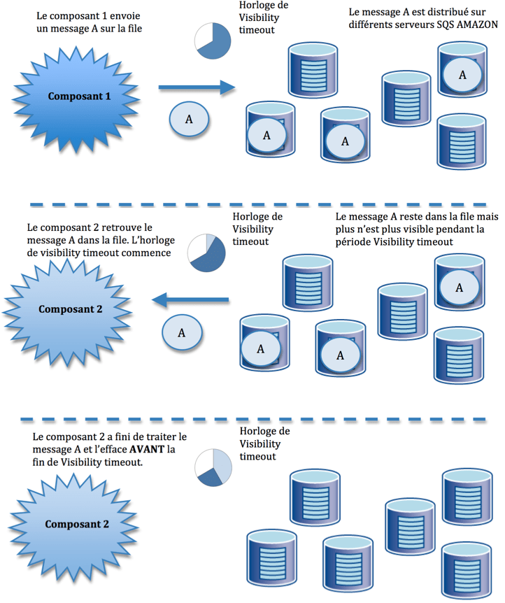 Il s’agit d’un service web qui fait office de middleware typé MOM. Fonctionnant sans logiciel particulier, ni configuration de pare-feu à mettre en place, SQS peut être utilisé indépendamment d’EC2 et n’importe quel ordinateur relié à Internet pour poster ou lire des messages. SQS ne garantit pas que les messages soient publiés selon une logique FIFO puisque lorsqu’un message est lu, il devient invisible pendant une certaine durée (visibility timeout).