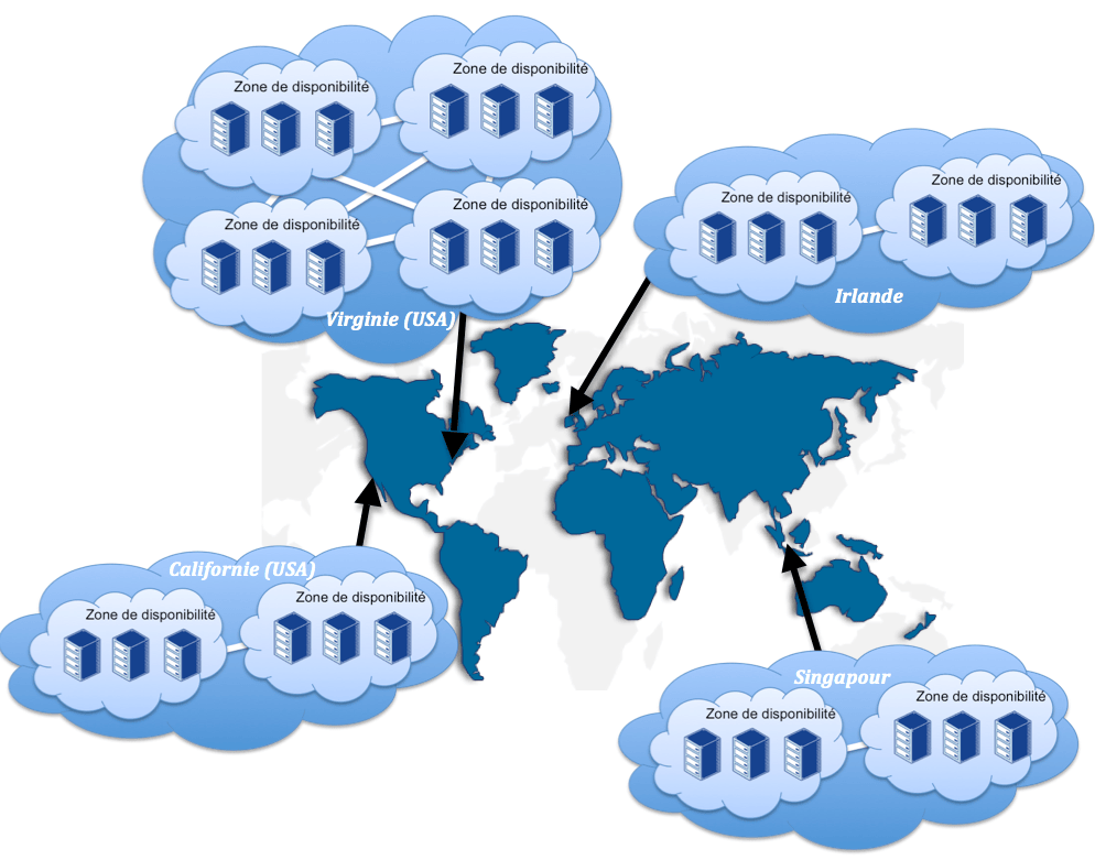 Contrairement à GOOGLE, AMAZON permet de définir l’emplacement géographique de certaines ressources. Pour cela, les concepts de régions et zones de disponibilités ont été introduits. Une région est une zone géographique – Europe, Asie, Etats-Unis Est et Ouest– composée de plusieurs zones de disponibilités. Les zones de disponibilités sont des emplacements distincts conçus pour ne pas être impactés par un dysfonctionnent d’une zone de disponibilité voisine. Néanmoins, les connexions entre les zones de disponibilités d’une même région sont optimisées pour fournir une faible latence.