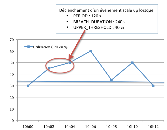 - Les événements lancés selon des critères d’augmentation et de diminution d’un groupe de Machines Virtuelles – aussi appelés triggers portent sur tous les éléments qui peuvent être agrégés par le service de monitoring CloudWatch pour des statistiques : CPU, réseau, disques… La définition d’un trigger passe notamment par les paramètres suivants : period, breachDuration, valeur du seuil bas et valeur du seuil haut de la statistique. La période exprime l’intervalle de temps entre deux évaluations de la statistique faites par CloudWatch. Le paramètre BreachDuration indique le temps pendant lequel la statistique doit dépasser la valeur limite haute ou basse, avant que l’événement ne soit lancé.