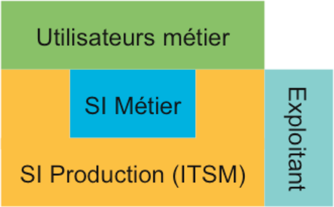 La figure suivante montre que le système d’information métier s’appuie sur le SIP afin de bénéficier des processus de management (ITSM). Le SIP est accessible aux utilisateurs au sens large, aussi bien métier (via le helpdesk, accès aux tableaux de bord...) qu'à l’exploitant (supervision, déploiement, capacity planning...). Il est cependant grandement orienté vers l'exploitant.