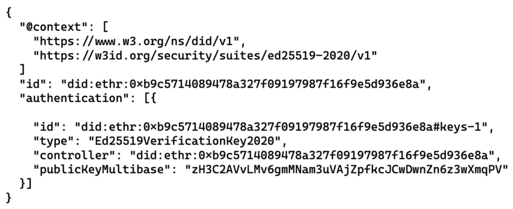En plus de servir d'identifiant, un DID a pour fonction de faire le lien entre un sujet et un document appelé le DID Document. Un DID Document est un fichier au format JSON comprenant toutes les informations publiques d'un sujet (ses clés pour l'authentification, etc.). Chaque DID Document, dans sa version la plus simple, prend cette forme: