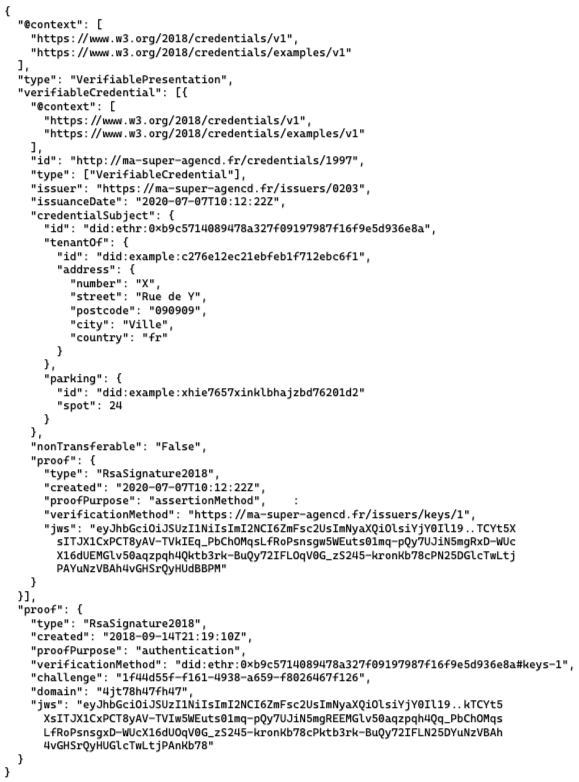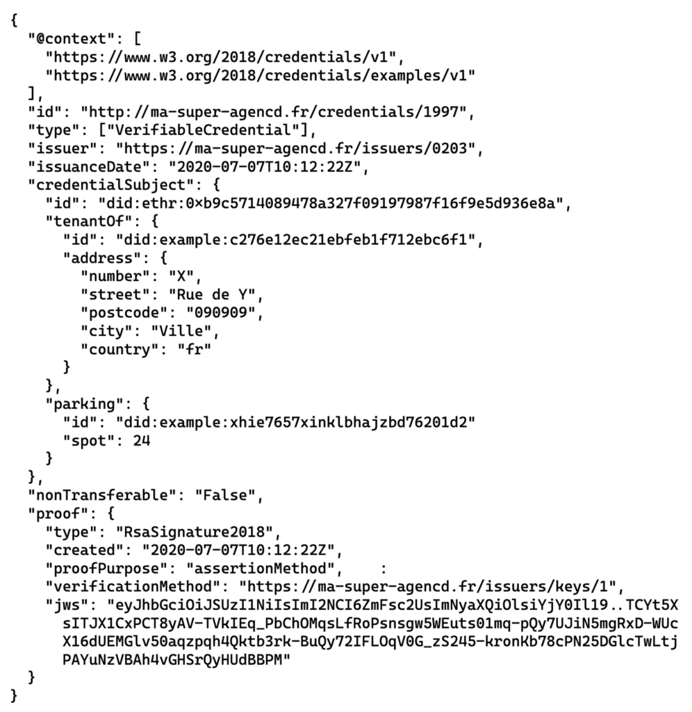 Les VC sont sous la forme JWT. Un JWT (ou JSON Web Token), est un jeton d’accès permettant l’échange de données sécurisées entre deux parties. Il contient toutes les informations d’une entité et est principalement utilisé lors de processus d’identification. Dans notre cas, la VC aurait cette forme :