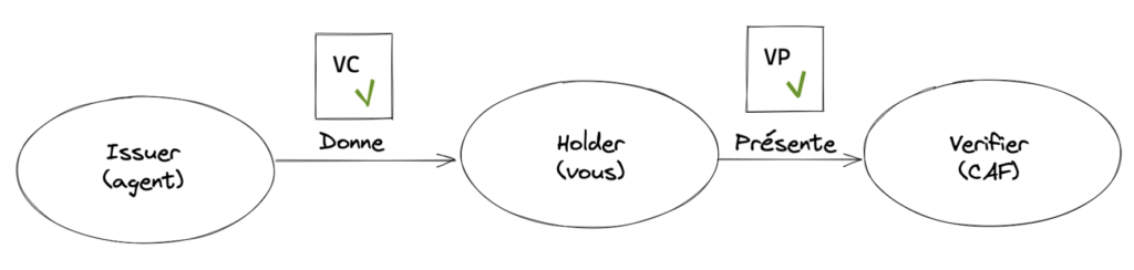 Si le possesseur d’une ou plusieurs VC veut partager les informations qu’elles contiennent avec quelqu’un d’autre, il doit regrouper les informations à partager sous la forme d’une Verifiable Presentation (VP) à la place.