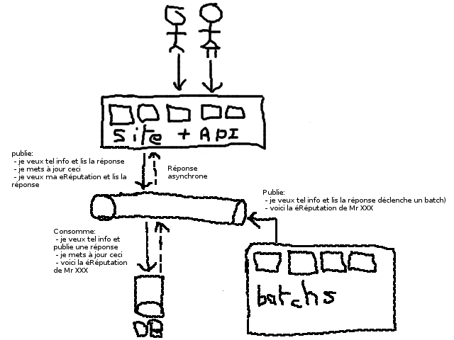 Vincent : Penses tu que ce serait applicable à ton problème de montée en charge ? Jean : Maintenant que tu en parles, c'est vrai qu'il y a de grosses similitudes... Un consultant m'a d'ailleurs récemment recommandé de re-architecturer la solution autour d'un bus de message. Il disait que si les composantes de la solution communiquaient au travers de files de message, cela découplerait l'ensemble et permettrait de réguler les montées en charge plus facilement.... (dessinant sur un autre bout de mouchoir) Ca ressemblait un peu à cela.