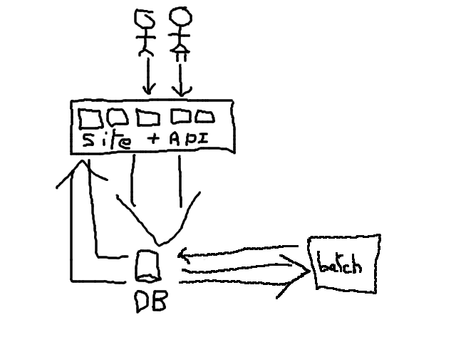 Vincent : Donc vos serveurs web et API sont trop chargés c'est cela ? Jean : Oui (dessinant sur un bout de serviette). Regarde, on a essayé d'en ajouter de nouveaux mais cela n'a pas amélioré les temps de réponse... vincent : Pourquoi ? Jean : Parceque le nombre de requête par seconde à la base de données a augmenté. Et cette dernière atteint ses limites...