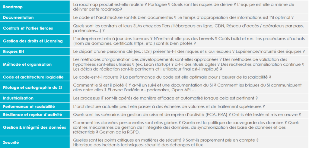 - Détecter les “red flags” techniques et en particulier autour de la production logicielle