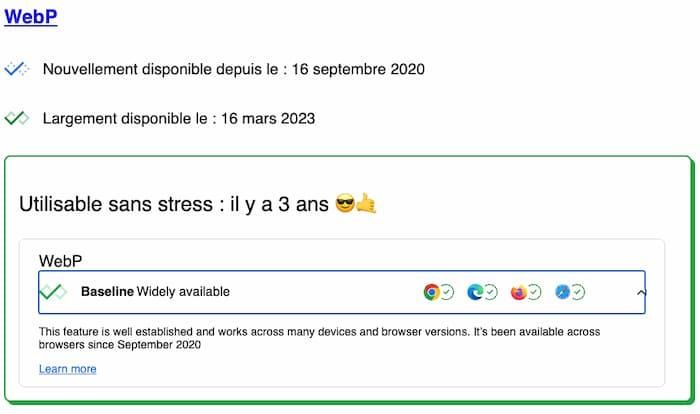 Durant les Lightning talks de Paris Web 2025, on a pu voir : « Avez-vous la base(line) ? » par Nicolas Arduin pour nous parler de l’utile https://baseline.nicool.fr/, c’est peut-être un site temporaire en attendant c’est bien pratique pour avoir des informations sur une fonctionnalité. Voilà un exemple avec le format WebP :