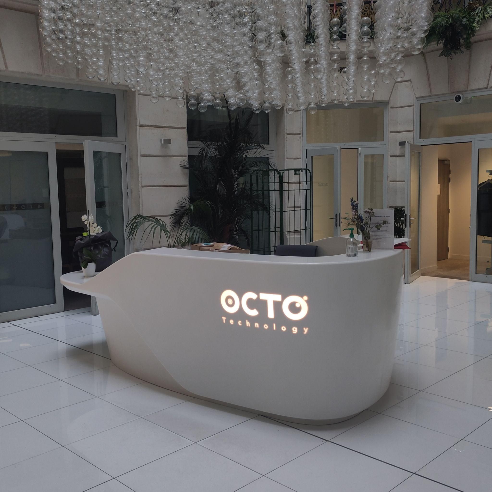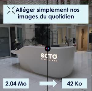 Si on zoome sur le texte et le logo OCTO du comptoir d'accueil, on remarque bien la différence entre la partie gauche (non compressée) et la partie droite compressée.
