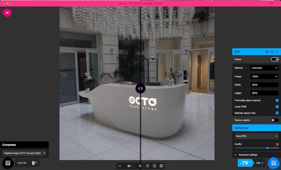 En ouvrant l’image, on voit à gauche le format et la taille d’origine. À droite, on voit une suggestion, très comparable à ce que réalise ImageOptim. Soit une image compressée (avec perte bien entendu, on y revient juste après) de 79 % pour avoir une taille de 436 ko.