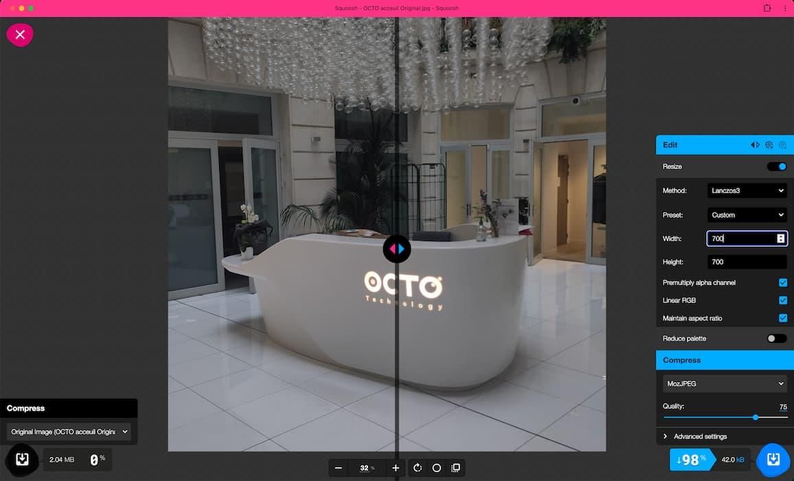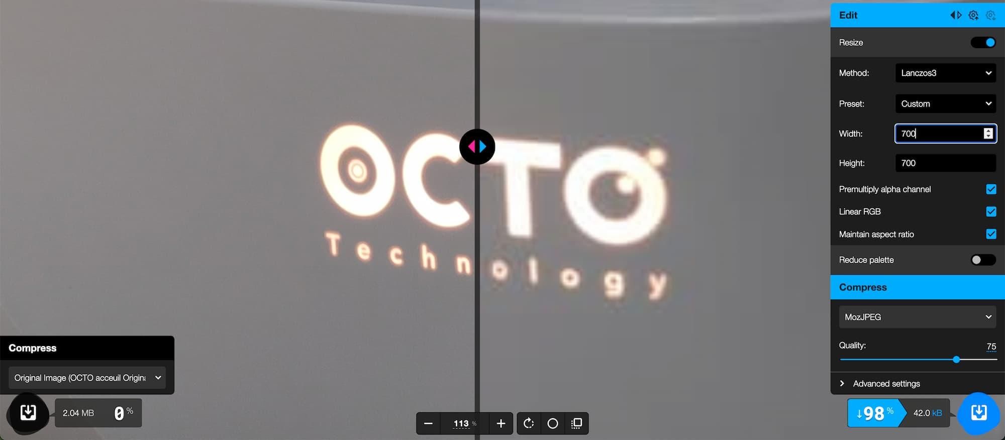 Mais si l’on réduit la taille de l’image de 2 976 pixels à 700 pixels, on arrive à compresser de 98 % tout de même pour arriver à une image de 42 ko.