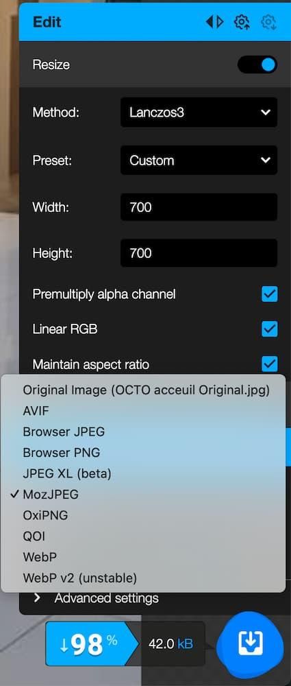 Il est tout à fait possible de changer le format de l’image puisque Squoosh gère les formats les plus courants (à l’exception des formats non vectoriels comme SVG).