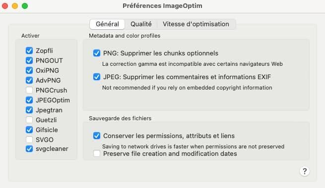 ImageOptim est une interface graphique regroupant des outils d'optimisation d'images sans perte tels que : Zopfli, PNGOUT, OxiPNG, AdvPNG, PNGCrush, JPEGOptim, Jpegtran, Guetzli, Gifsicle, SVGO, svgcleaner et MozJPEG. Comme on peut le retrouver dans les paramétrages de l’application. On peut choisir d’activer ou non ces outils.