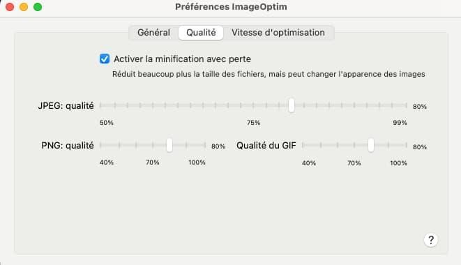 Il est possible également d'activer l’option de “minification avec perte” applicable sur les images aux formats JPEG, SVG, GIF animés et PNG.