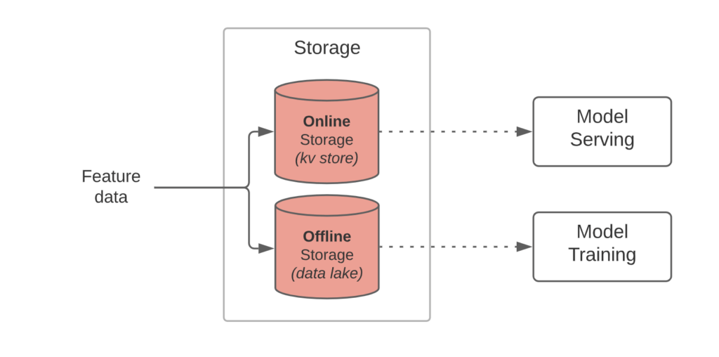 Storage: Un feature store contient généralement deux bases de données, une BDD avec une grande profondeur temporelle (offline store), cette base contient les données qui sont servies via le SDK pour l'entraînement des modèles. Le feature store contient aussi une BDD qui contient les données les plus fraîches et les données en streaming (online store), elle est plus performantes pour servir plus rapidement.