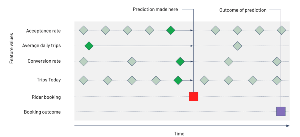 Pour éviter que les modèles soient entraînés sur des données de tests (on parle de feature leakage dans ce cas), les feature stores permettent de récupérer les données en utilisant un point temporel.