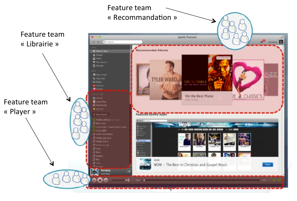 Voici un exemple que nous donne Henrik Kniberg des Feature teams mises en place chez Spotify :