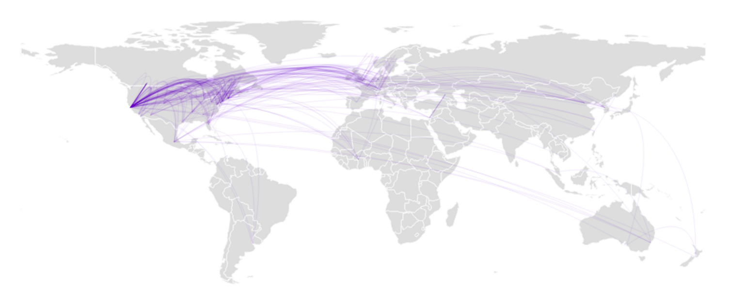 D3.js foi combinado com topojson para uma prestação perto ideal de fronteiras de países, permitindo sobrepor outras informações, tais como os links exibidos na figura 2.