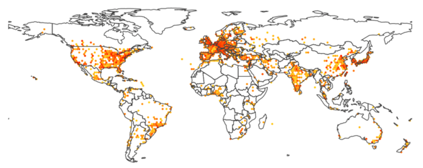 Uma vez que citações poderiam ser atribuídas a coordenadas geográficas, parecia natural exibi-las em um mapa do mundo. Os resultados apresentados na Figura 6 mostram uma pavimentação hexagonal, com a cor que indica o número de locais de publicações na área. Usando o controle deslizante para navegar ao longo dos anos revela, por exemplo, o recente aumento dramático da produção dos países BRICS.