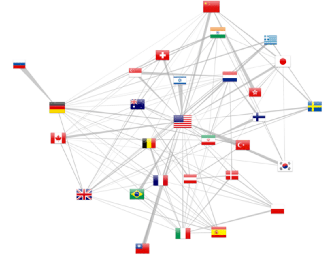 As várias citações afiliadas permitem retirar colaborações entre países (pelo menos a partir de 2012, como revelado pela figura 5). O modelo de força atrai mais fortemente os países com mais colaborações, enquanto o número total de publicações é relatado pelo tamanho da bandeira. Além disso, d3.js permite desenhar arestas trapezoidais, em que a espessura de uma extremidade mostra a importância relativa da colaboração. Por exemplo, no canto superior esquerdo, a Rússia está exclusivamente ligada com a Alemanha, ao passo que este último país como outras colaborações. A mesma observação pode ser feita para a relação Israel-EUA.