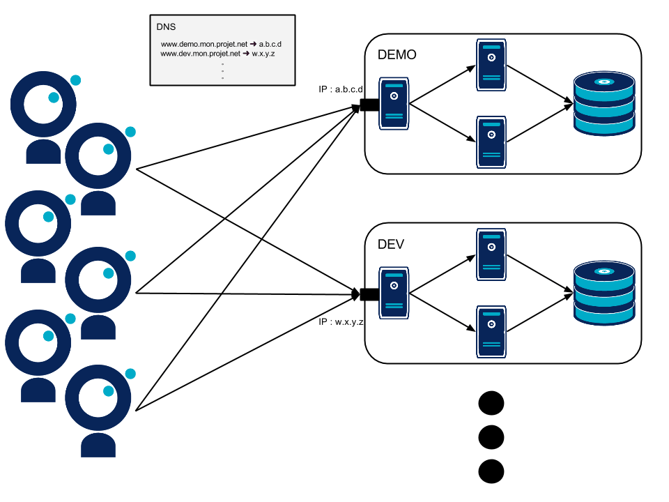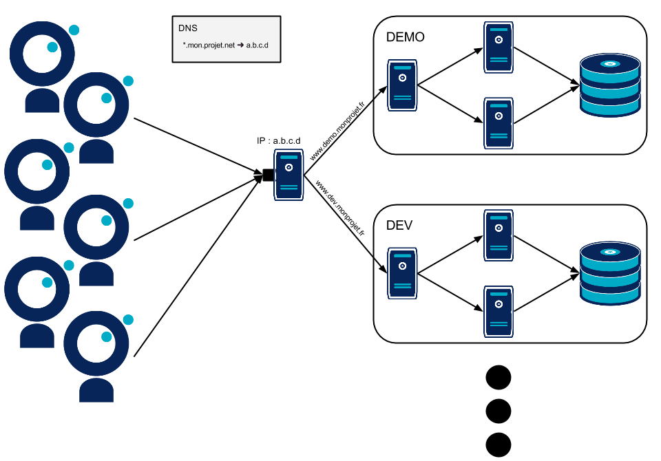 Afin d’éviter cette limitation, il est possible de mettre en place un wildcard DNS (*.mon.projet.net) pointant vers une IP unique sur laquelle est installé un reverse-proxy HTTP dont la configuration sera modifiée afin de diriger les requêtes destinées aux différents environnements en fonction de leur en-tête 'Host'.