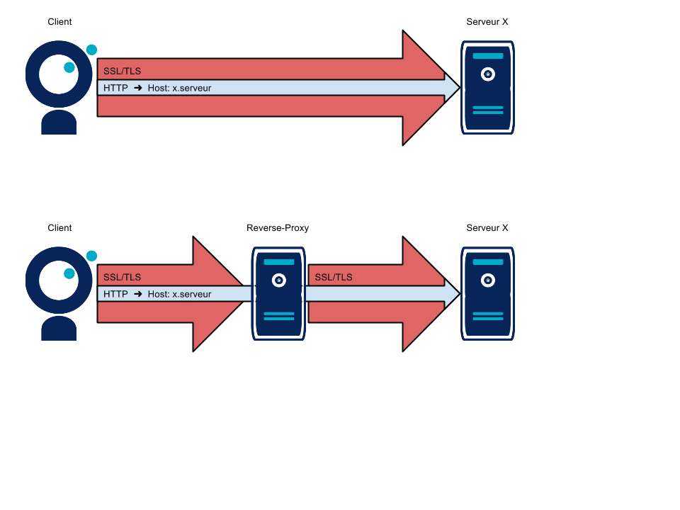 Au cours d’une communication HTTPS relayée par un reverse-proxy HTTP, le client n’établit jamais de connexion SSL/TLS directe avec le serveur.