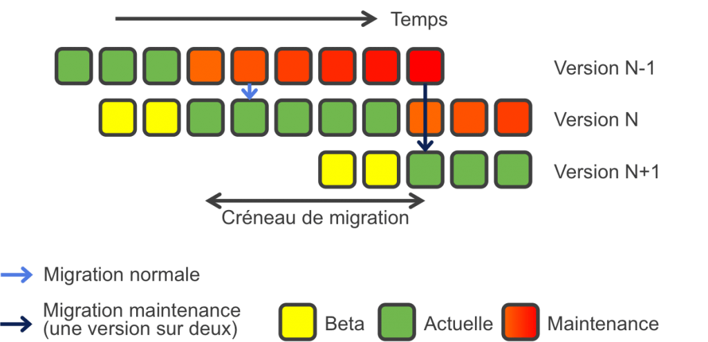 Une version majeure d’un service est une version qui n’est pas compatible avec la version précédente. Pour un consommateur, passer d’une version à l’autre peut donc demander des modifications. Pour que les projets puissent organiser ces migrations correctement, il est d’usage de maintenir plusieurs versions disponibles pendant un certain temps. Le choix du nombre de versions à maintenir en parallèle est un arbitrage entre le fournisseur de services et les consommateurs :