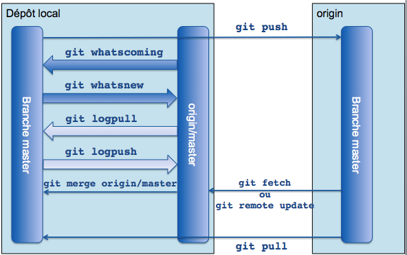 git logpushlistera les commits qui seront poussés lors du prochaingit push origin $(git currentbranch),git logpulllistera les commits que l'on s'apprête à merger lors du prochaingit pull,git whatsnewdétaillera sous forme d'un diff ce qui va être poussé au prochaingit push origin $(git currentbranch),git whatscomingdétaillera sous forme d'un diff ce qui va être mergé au prochaingit pull.