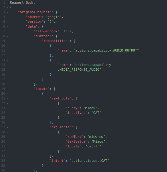 | textValue | Value transcribed in the default language of the Google Home device | “Ouaf ouaf”, “Miaou”, “Meuh”, “Onk” |