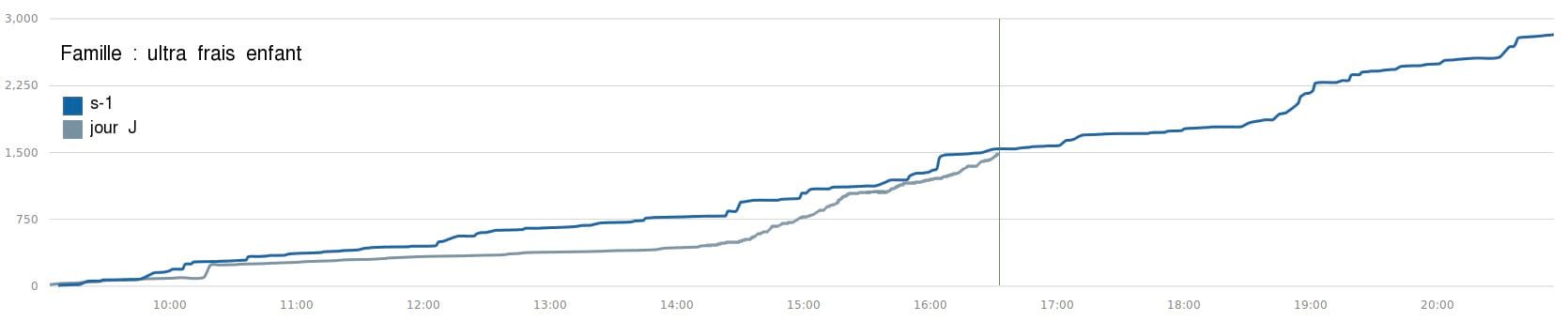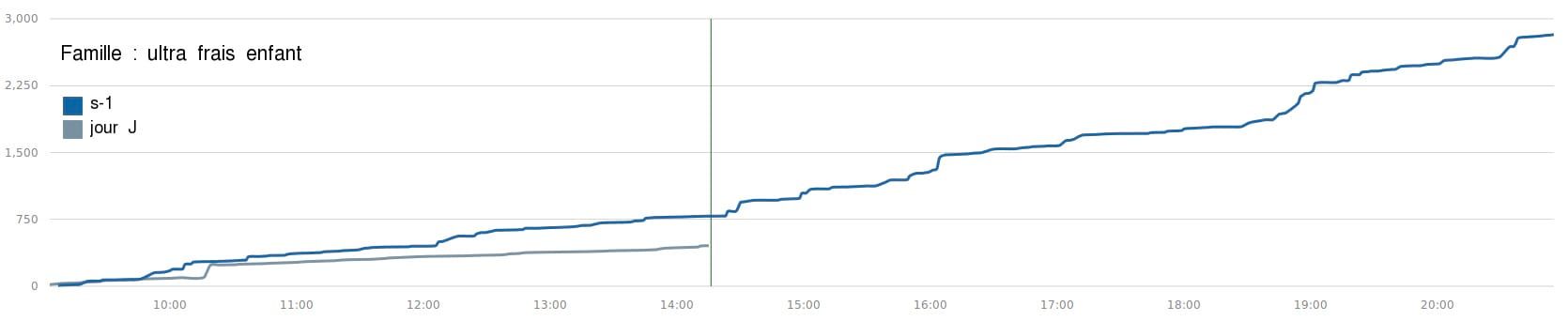 Aujourd’hui, la famille “jambon cuit” est en top des ventes, plus que d’habitude: il serait temps d’approvisionner le stock. Le magasinier est averti, le bon de commande est auto-généré et prêt à être envoyé avec les quantités recommandées par l’algorithme de prédiction des achats qui croise les historiques de vente avec d’autres données, notamment le calendrier des vacances et la météo. Toujours sur le tableau de bord, il voit qu’à l’inverse, les ventes des produits “ultra frais enfant” tirent la langue : un retard de 40% par rapport à jeudi dernier est indiqué. Il demande alors la courbe d’évolution des ventes de la journée pour cette famille :