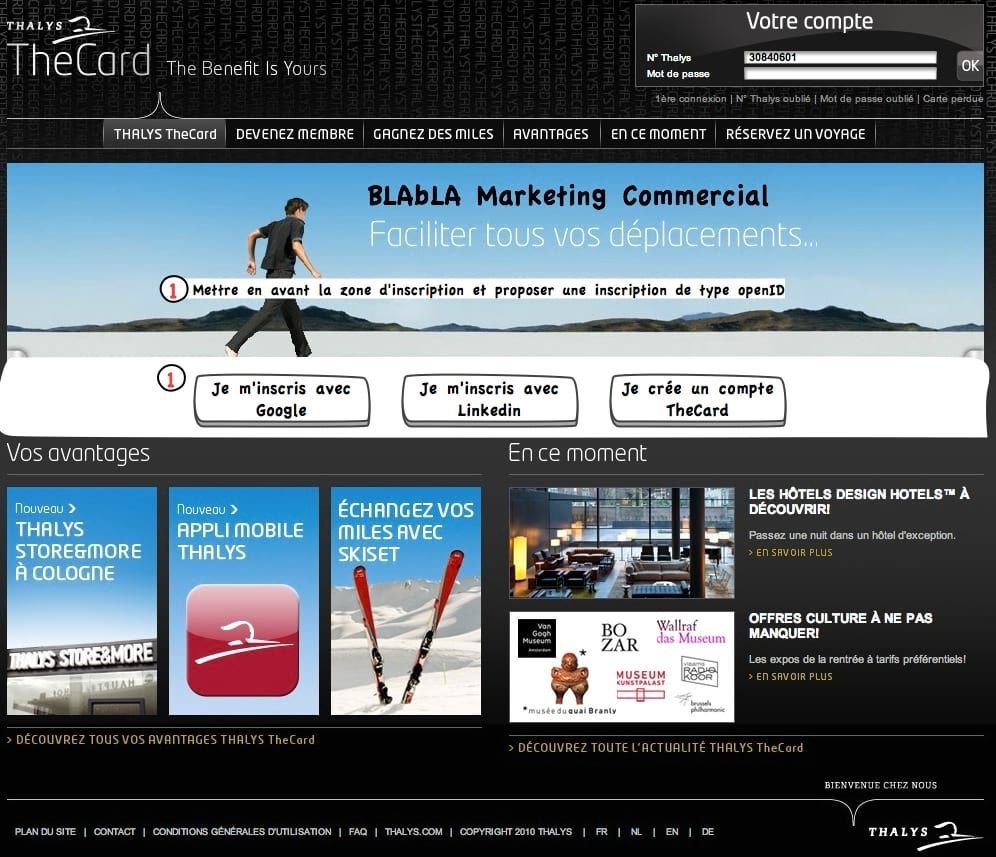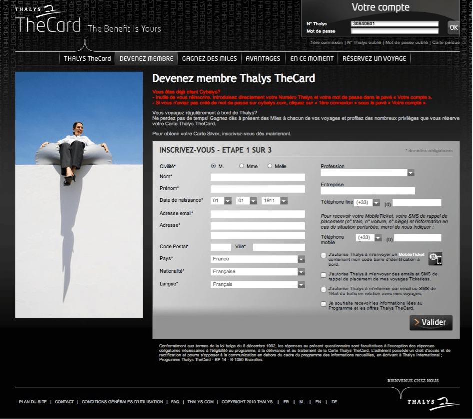 Je souhaite profiter des avantages de la carte le plus tôt possible, et, comme je dois rapidement réserver un billet de train pour mon prochain voyage, j'en profite pour souscrire. Qui dit inscription dit saisie du légendaire et incontournable formulaire d’inscription, formulaire que j'abomine... Je compte vraiment sur Thalys pour que ce moment soit le plus rapide et le moins douloureux possible.