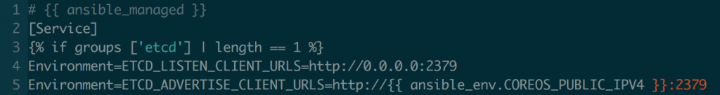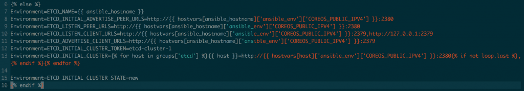 All of these configurations can be made either with environment variables or with flags when starting the etcd2 service. The ansible_env.COREOS_PUBLIC_IPV4 variable will be replaced by the node's public IP. I do this often on this project. Then, I just start and enable the service. This is done with the systemd module, and that's why we need Ansible 2.2.