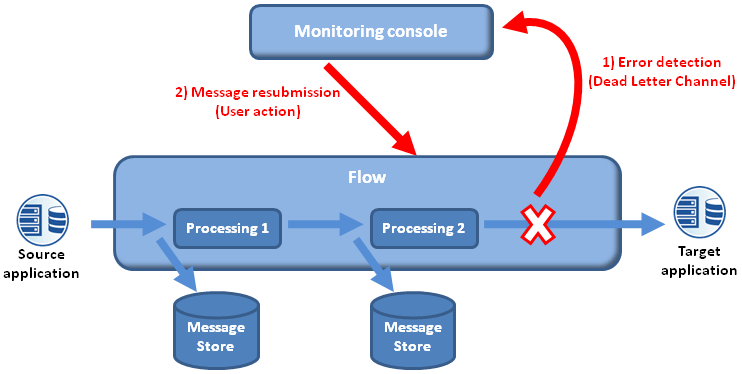 Although lightweight ESBs support the detection of errors (Dead Letter Channel) and anomalies (Invalid Message Channel), they do not offer any framework for resubmitting messages. This implies either resubmitting the message from the source system or performing a corrective action on the target system.