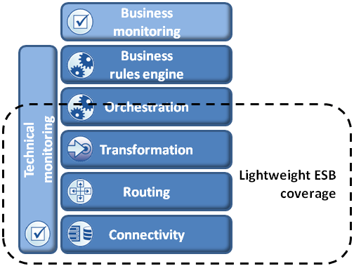 Time is coming to introduce another term: the integration framework. Both lightweight ESB and integration framework notions are very close. Integration framework could be considered as a deployment mode of a lightweight ESB. There is at least a big overlap between them.