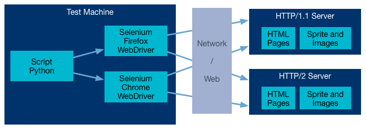 On the client side, a Python script has been developed to request pages through two browsers, Firefox 41.0 and Chrome 45.0, driven by Selenium WebDriver [9]. Selenium allows to have a new navigator context at each request, in order to avoid caching effects. Indeed, if images were to be cached by the browser, we would not really test the protocol since there would be no actual transfer (only an empty body reply with 304 code). Selenium finally allows to easily inspect the DOM to retrieve the timespan measured by Javascript and displayed on the page.