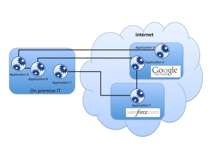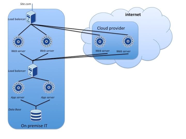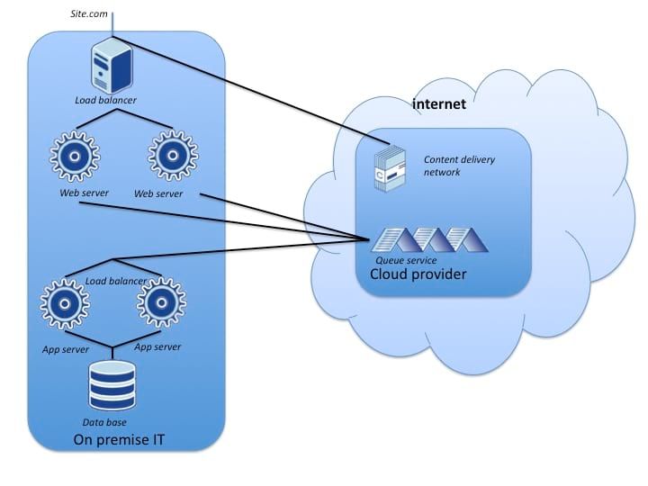 Il ne s’agit plus d’applications entières, mais uniquement de briques techniques qui sont situées sur le cloud public. On retrouve classiquement des services de CDN (content delivery network), des middlewares de type MOM, du stockage (comme S3 par exemple) …
