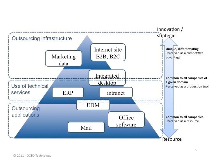 In addition, applications for enterprises can be segmented in three main categories according to their specificity : shared by all companies (mail, calendar, timesheets, ...), common to distinct business lines but without differentiating issues (middleware, storage services, ...) or strategical within a same activity domain (computation library, algorithm, innovating services, ...). For more information on this subject, see USI session of Julien CABOT (again in French!).