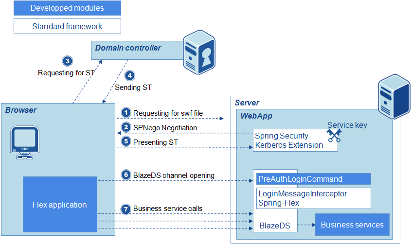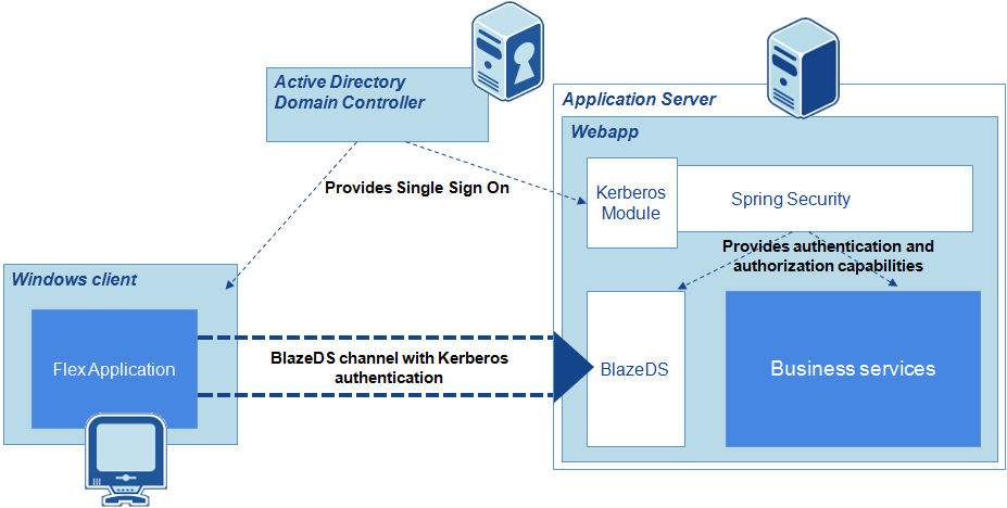 Em teoria, o Spring Security integra-se ao BlazeDS por meio do projeto Spring-Flex. Infelizmente, este suporte está atualmente limitado à autenticação com nome de usuário/senha. Desse modo, não temos esperança em tirar proveito do Spring-Flex para autenticação Kerberos. Detalhamos nossa solução a seguir.