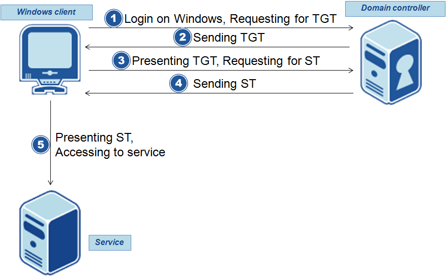 O protocolo é baseado na troca de permissões com um controlador de domínio. Este diagrama mostra como aquelas trocas são realizadas quando um cliente acessa um serviço protegido pelo Kerberos: