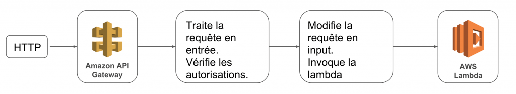 API gateway récupère une requête HTTP envoyée par un client et fait une vérification sur les autorisations. Il s’agit ici des autorisations IAM qui définissent que API Gateway a les droits d’appeler la lambda et non pas d’une authentification applicative. Ensuite, la requête est remodelée dans un événement que la lambda va recevoir en entrée.