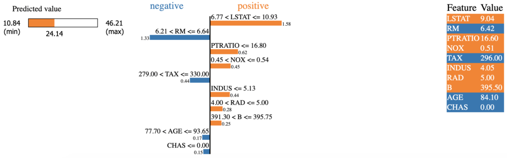 <br>import lime.lime_tabular <br>explainer = lime.lime_tabular.LimeTabularExplainer(train_boston_X.values, mode='regression',training_labels=train_boston_y, <br> feature_names=boston_dataset.feature_names, categorical_features=['CHAS'])<br>explanation = explainer.explain_instance(test_boston_X.values[0], sklearn_regressor.predict)<br>explanation.show_in_notebook()<br>