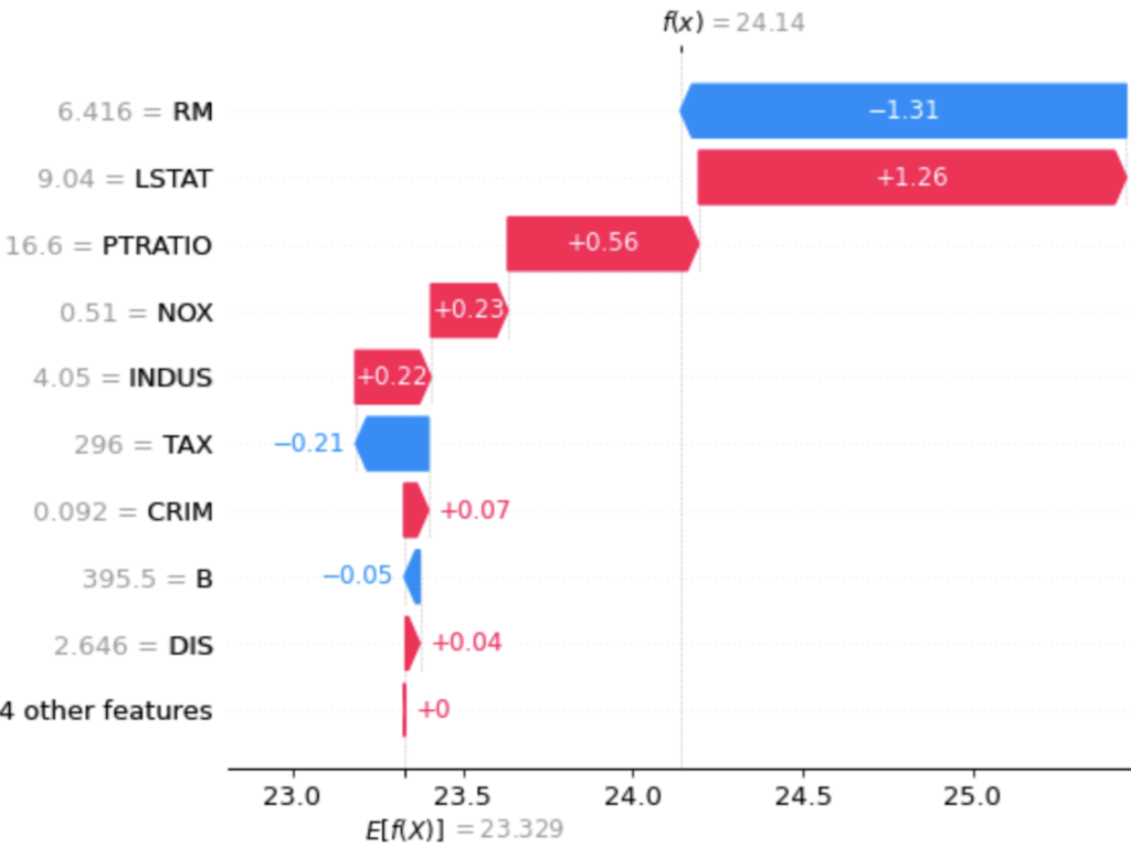 Si on commence la lecture du plot par le bas, on voit que le gain ou la perte par rapport à la moyenne des prédictions est égale à 0, puis en remontant, on a un gain de 0.04 grâce à la valeur 2.646 de la feature DIS, puis une perte de 0.05 à cause de la valeur 395.5 de la feature B, etc. Ainsi, on peut visualiser pour cette coalition de valeurs la contribution de chacune à la différence entre f(x) et E(f(X)).