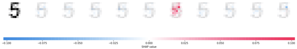 Chaque ligne représente une instance. La première colonne est notre vraie image et les autres représentent chacune une classe (0 à 9 de gauche à droite). Pour une colonne donnée, les carrés rouges ont augmenté la probabilité (ou score s’y apparentant) de prédire cette classe, tandis que les carrés bleus l’ont réduite. Par exemple le fait que la partie en haut à droite soit vide élimine le fait que ce soit un 9 (rouge pour la colonne 7, bleu pour 11).